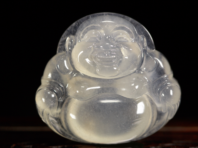 高冰種翡翠,質地細膩,天然透出一道佛光的雲彩,細膩的雕工,開懷大笑,讓每位信仰她的人得以庇佑。