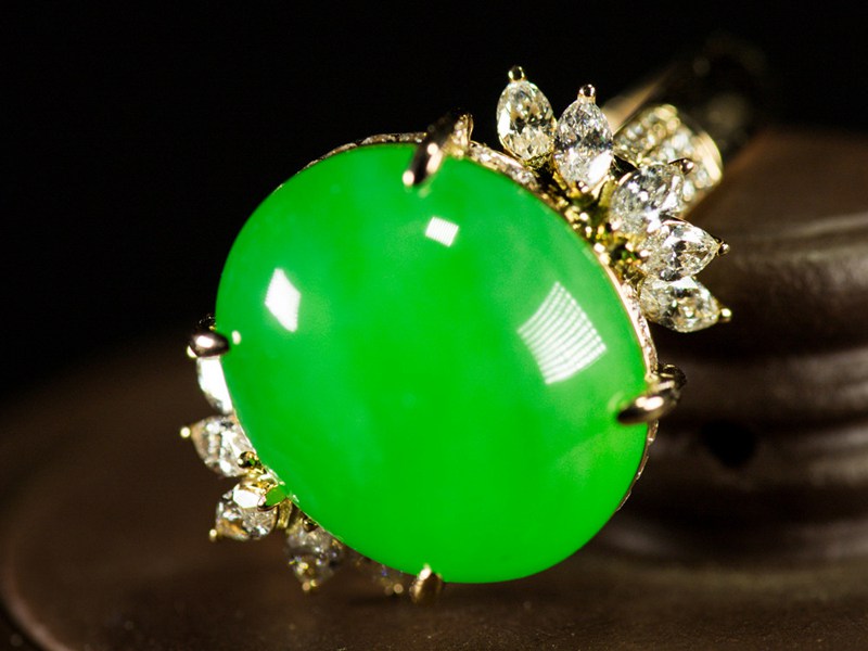 正陽滿綠,質地細膩,翡翠蛋面。與配鑽相輔相成,相互呼應,更加突顯翡翠的溫潤內斂。